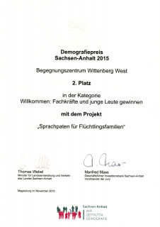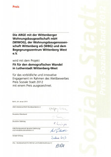 Beide hatten sich beteiligt an einem Wettbewerb zur "energetischen Sanierung von Großwohnsiedlungen" und eine Silbermedaille errungen - verbunden mit 70.000 EUR Preisgeld, welches genutzt wurde, um das vormalige Ladenlokal zu einer Begegnungsstätte für die Bewohner des Stadtteils umzubauen.